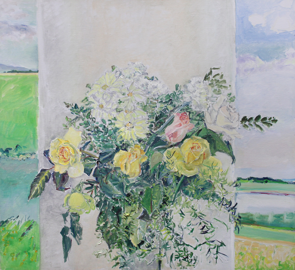 Known for expansive landscape paintings of the Canadian prairie, Knowles has always explored different subject matter and styles. Painting flowers, still lifes and gardens are not uncommon in her practice. However, for only those two winters, Knowles combined the contrasting elements of the landscape with beautifully arranged cut flowers in vases. Why?