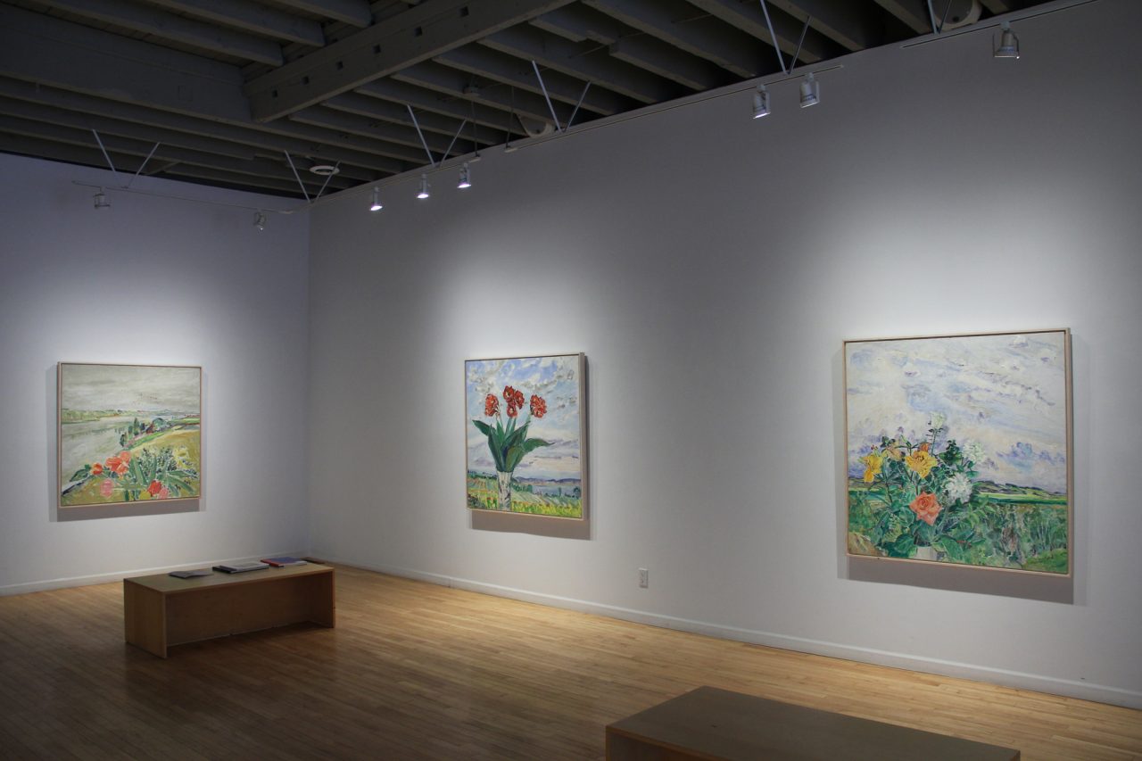 Dorothy Knowles introduces the paintings: “It was winter. I couldn’t get out to paint – or go to Emma Lake, where I would work in the summer – so I bought flowers to paint still lifes and brought them into the studio. The studio was full of landscape paintings which created an unexpected backdrop. It intrigued me – it was kind of bizarre. It was the artifice of the bouquet against nature that appealed to me, and maybe a way of bringing summer into the cold prairie months”.