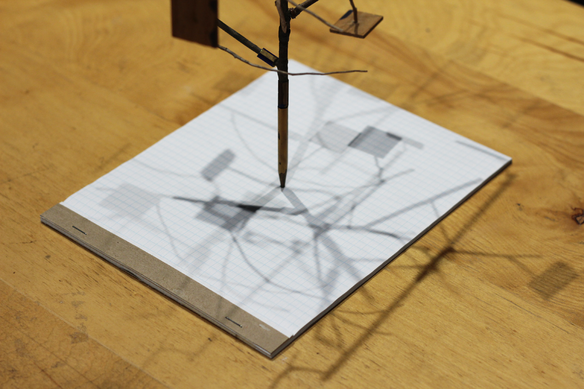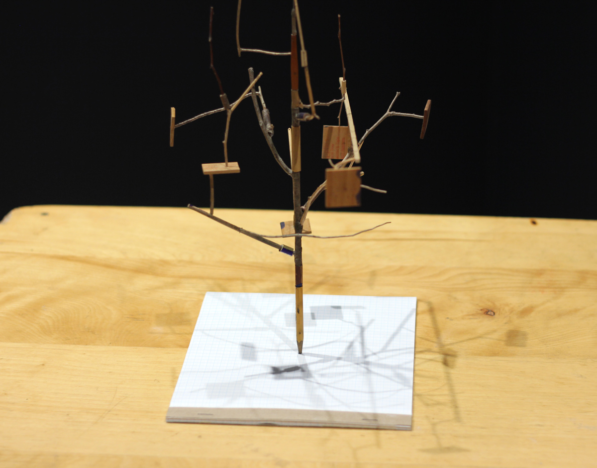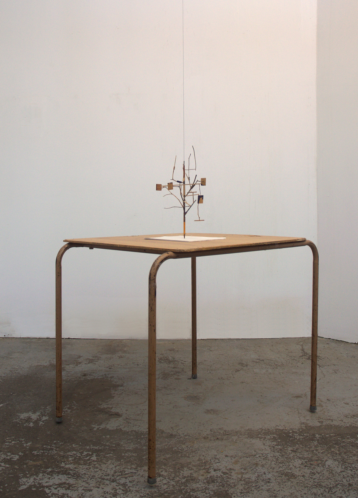 Twigs and mixed wood products, found stacking table, picture hanging wire